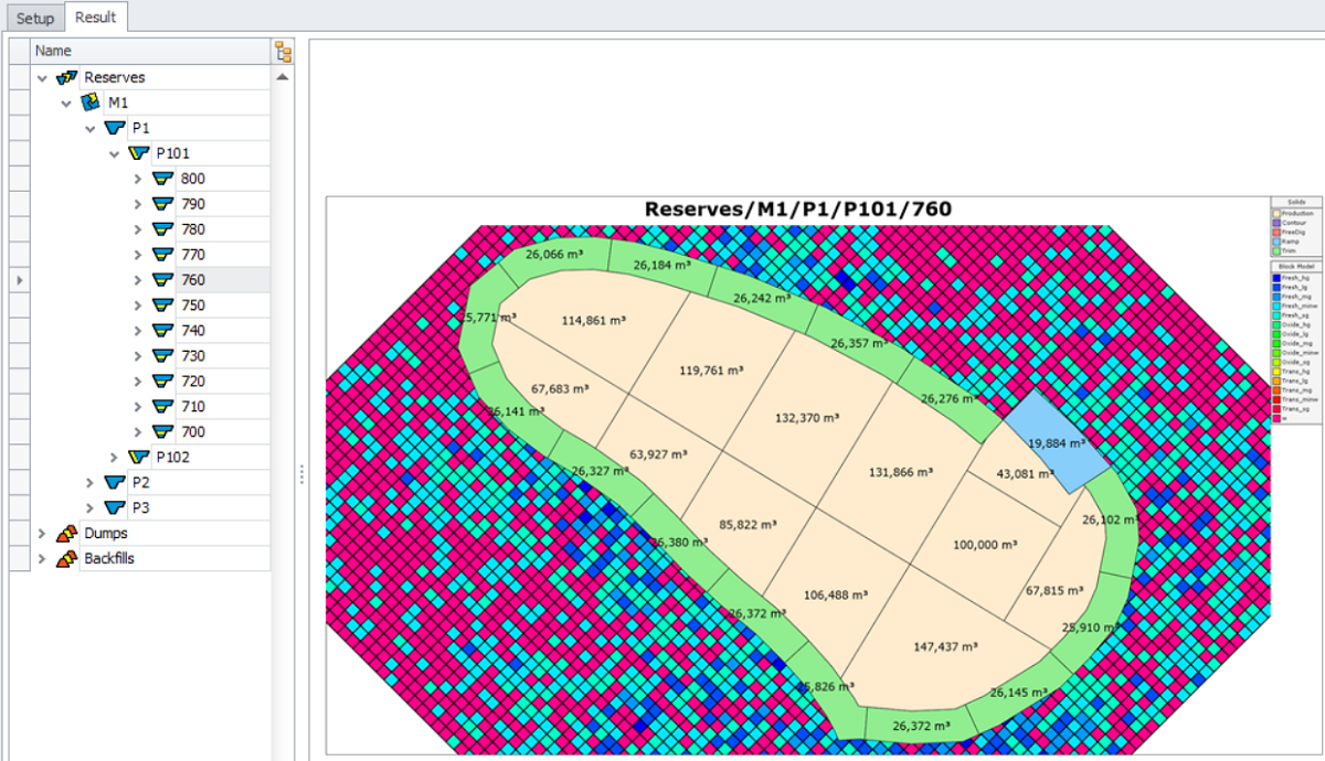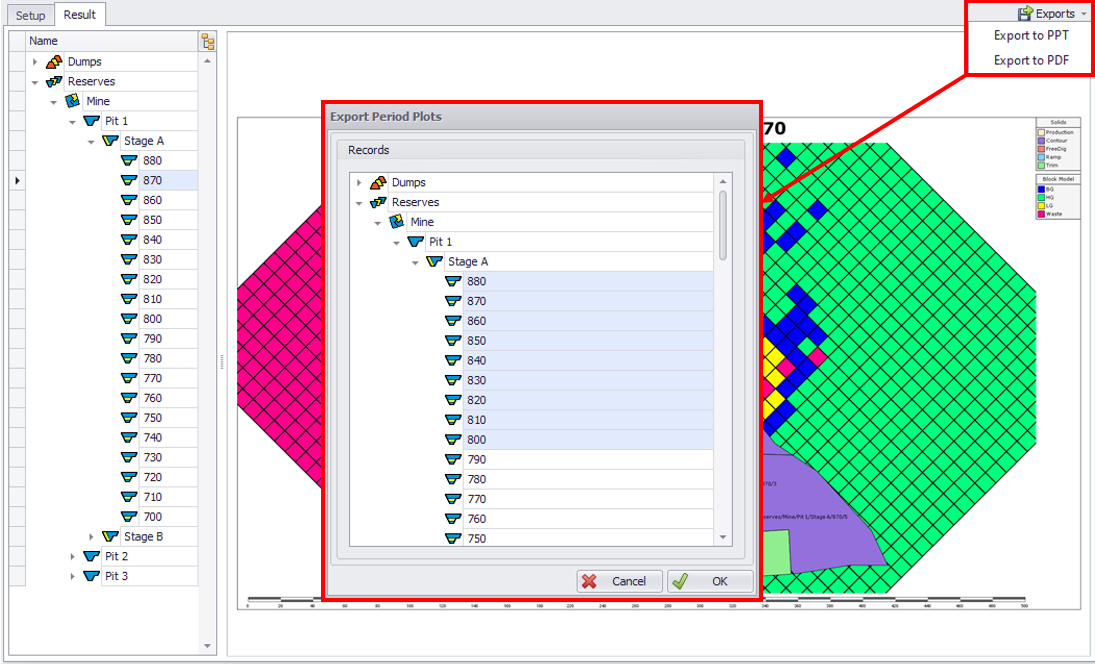 Note that it is not possible to display the level of the entire pit or stage, the selection may only contain benches, flitches and lifts.