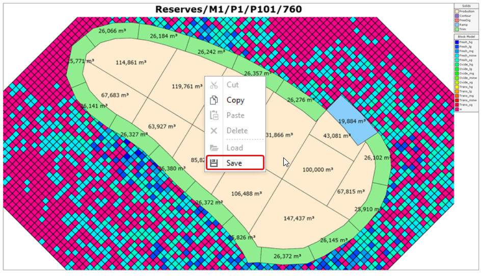 Use Constraints to hide parts of the block model based on some criteria, such as material type or grade threshold (same as in the Designer tab). |