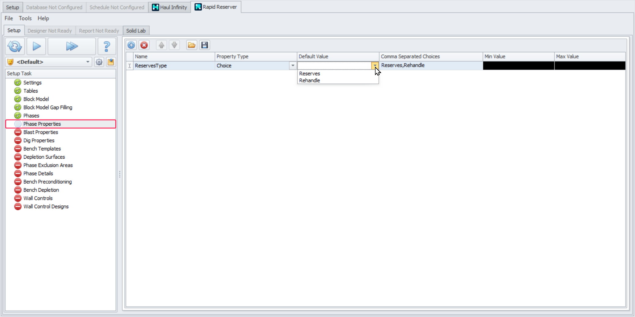 The Phase Properties step provides option to create additional properties for each phase. This might be used to flag some phases for special treatment, such as backfill ramp solids vs. reserve solids.