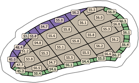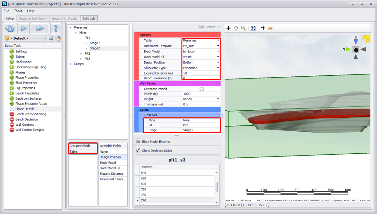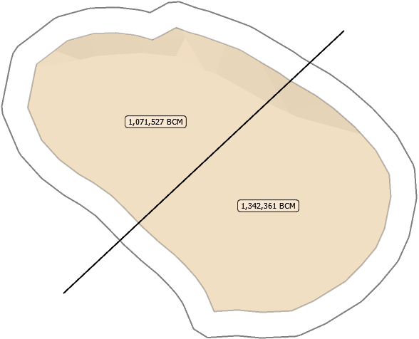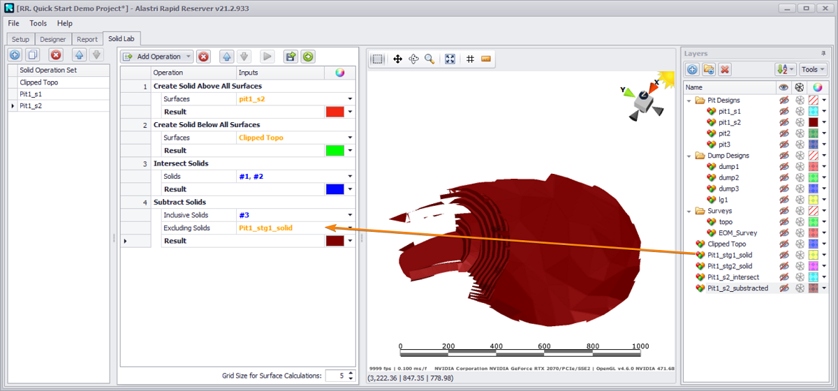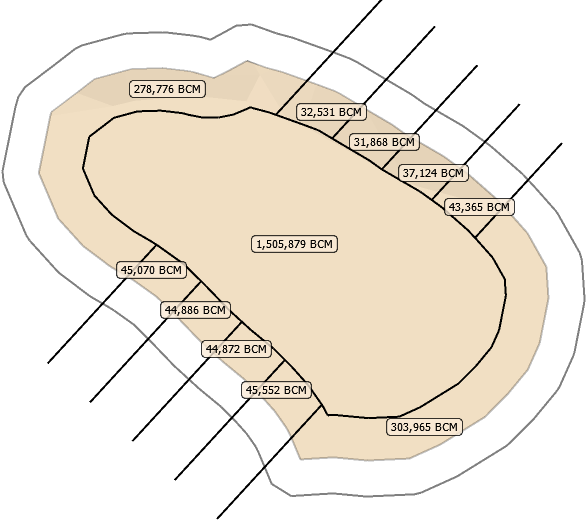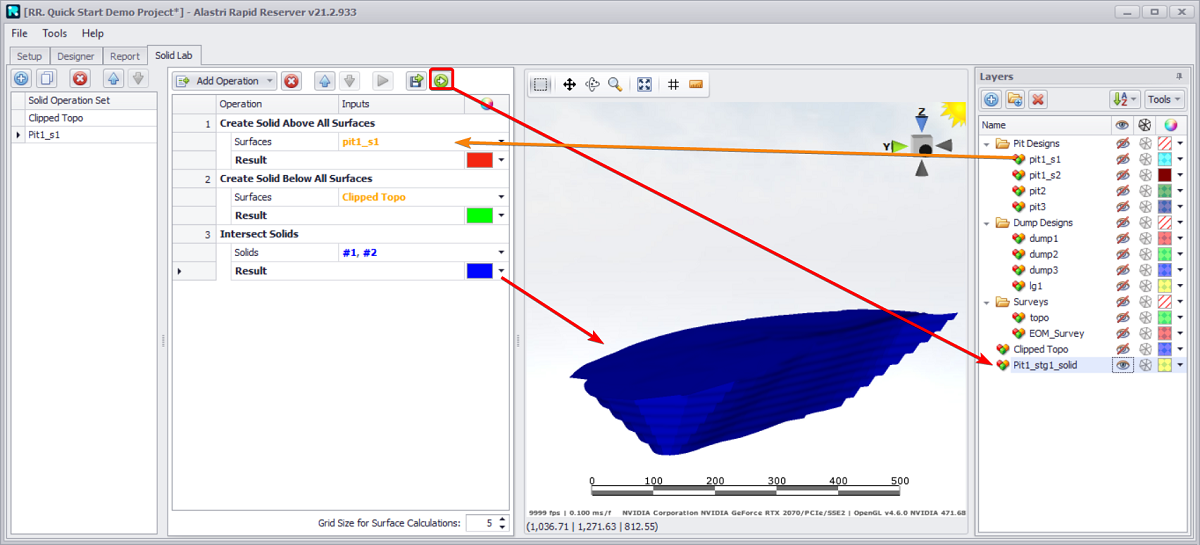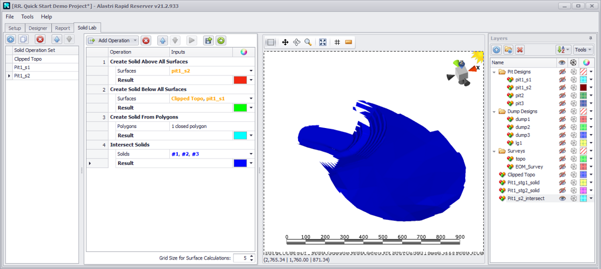 Blast reserves are calculated by intersecting the 3D solid with the block model cells.
