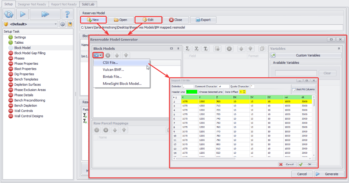 Block Models CSVs: “pit1a”, “pit2a” and “pit3a”;