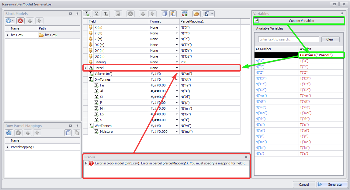 The Field column (on the left) lists the fields of the reserves model, and you will need to map them with the fields from the imported block models.