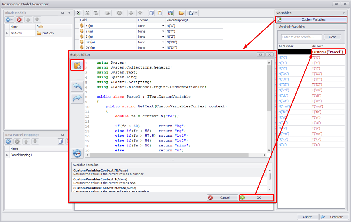 You can copy sample scripts from the Block Model Custom Variables section and paste them into the Editor window.