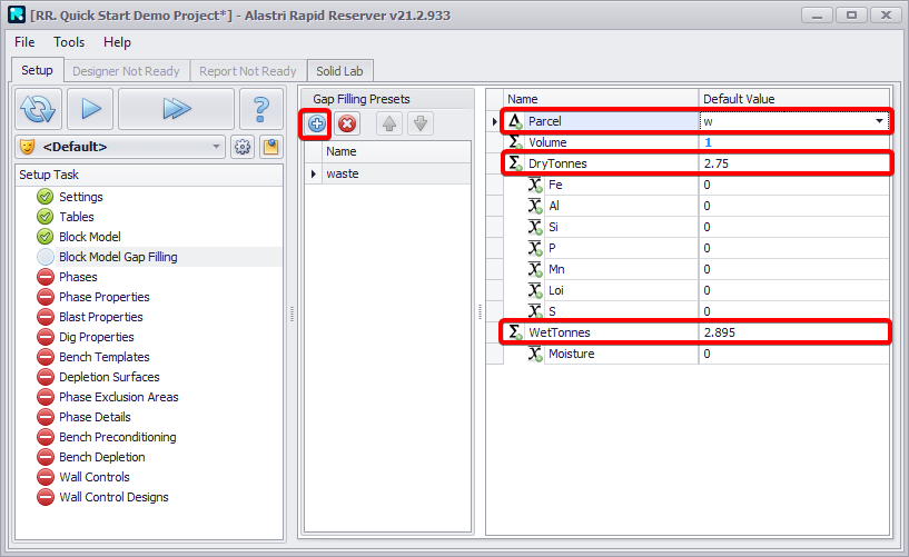 In the Gap Filling Presets column, add a new preset for the material used to fill the voids. Name it, for example, "waste".