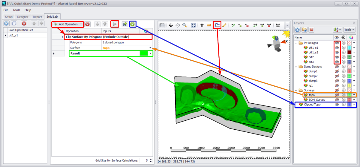 Blast solids and Dig solids may be displayed as 2D polygons or as 3D triangulations.
