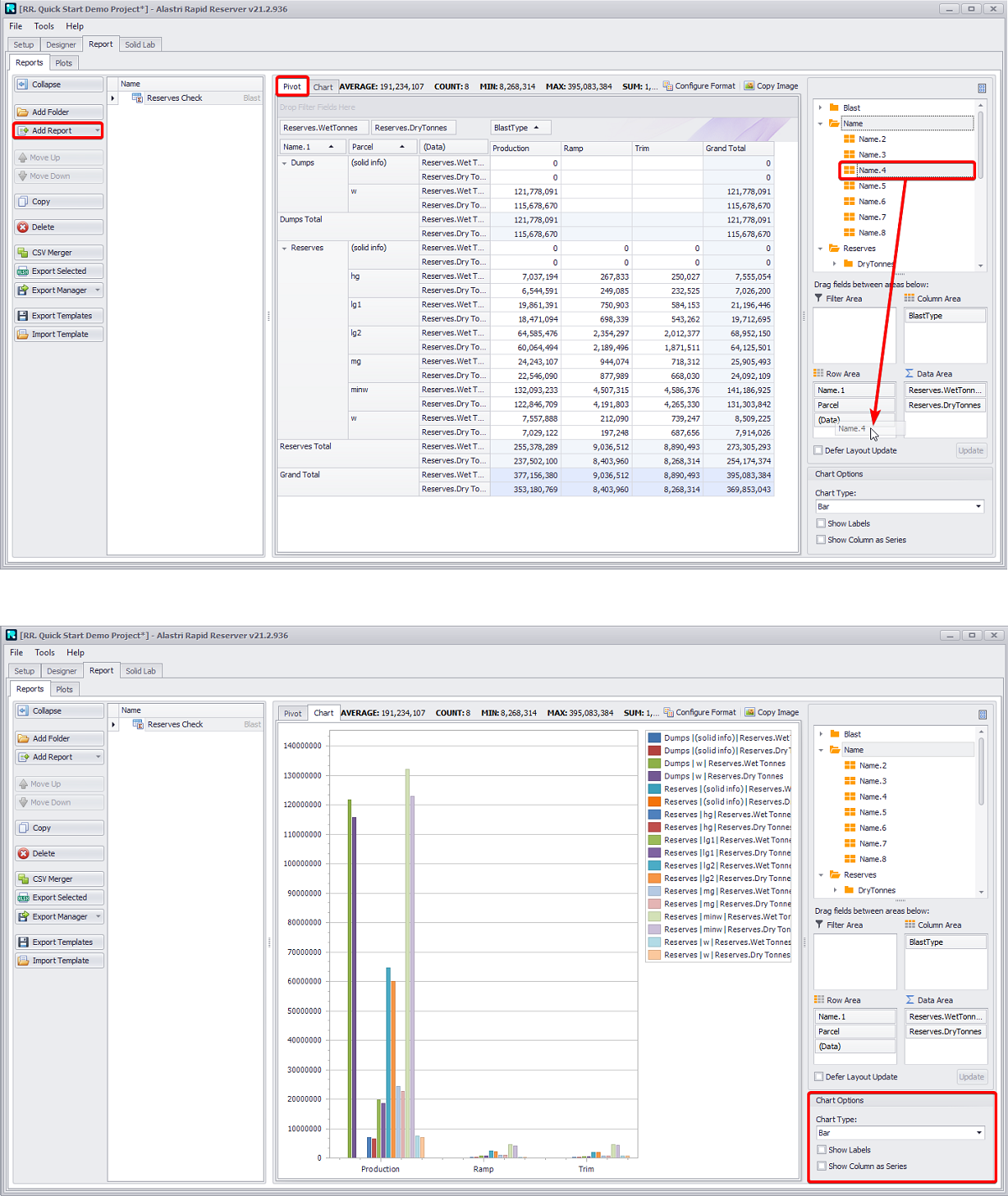 “Reserves.WetTonnes” and “Reserves.DryTonnes” to the Data Area.