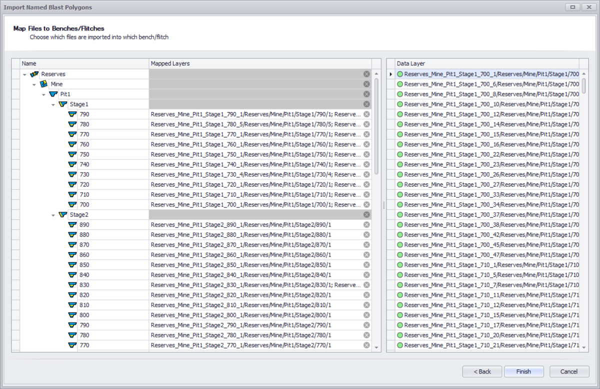 Review the mapping template to choose which files to be imported into which benches/flitches, and how the blasts/digs will be named.