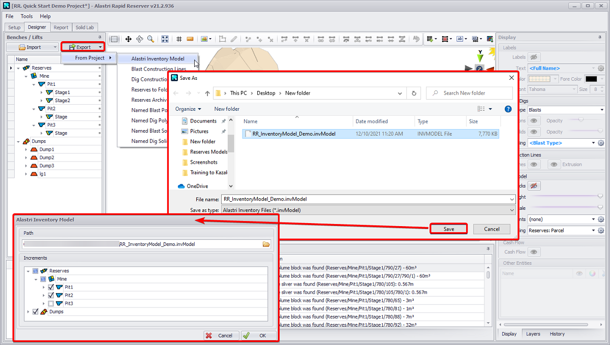 Export reserves model to Alastri Inventory Model files (“.invmodel”) for further import into Haul Infinity or Tactical Scheduler.