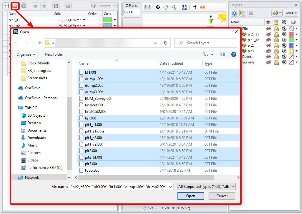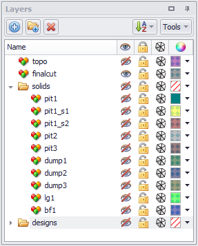 Triangulations and linework may be loaded in the Layers panel. This may be useful for visualising the pit extents, topography and design lines.