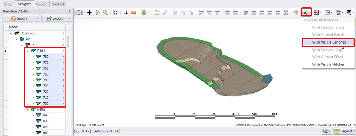 Designer tab > Benches/Lifts panel > Import button > Into Project > Named Blast Polygons.