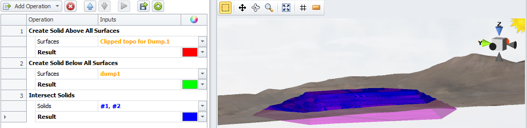 Create a solid below the Dump1 design and the natural surface file.