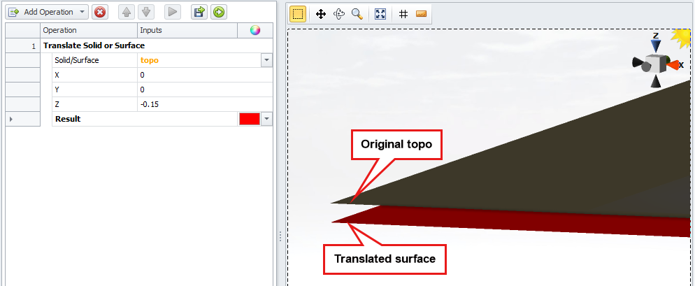 Select the Result row to see the result in the viewport. Zoom into to see the difference between original topo and translated topsoil surfaces Zs.