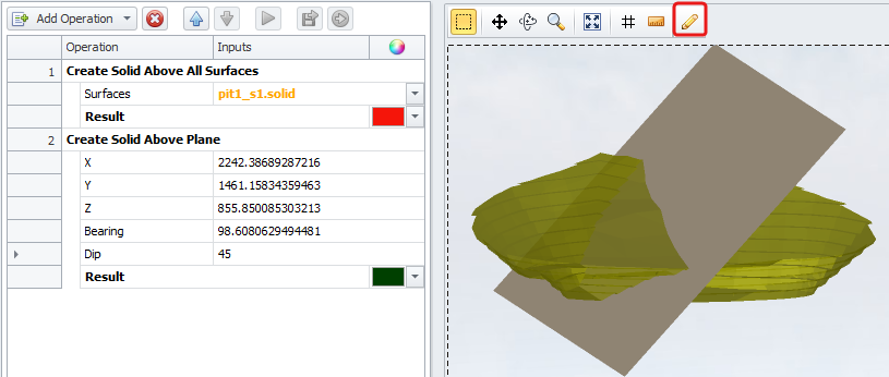 Define a plane by typing in X, Y, Z values, bearing and a dip. An upper surface is projected above this plane and a closed solid is triangulated. |