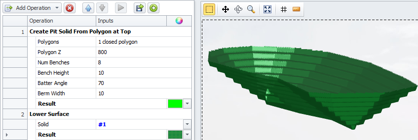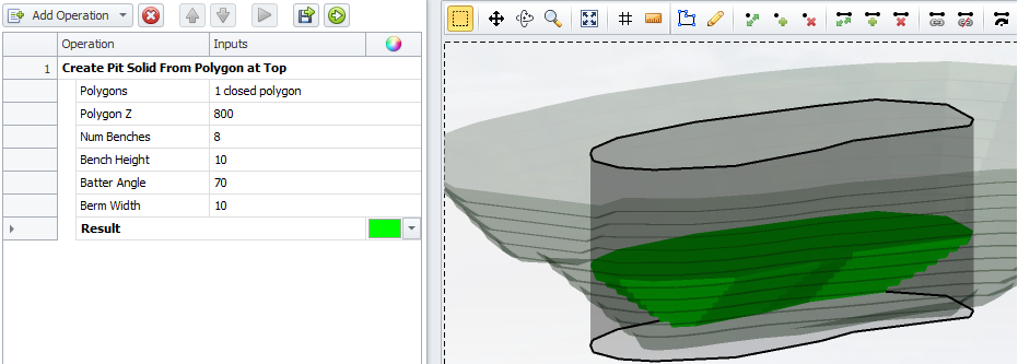 Pit solid is created from a polygon, bottom up. Draw a polygon, specify its Z level, number of benches, bench height, batter angle and berm width. Can be used for creating inner stages. |