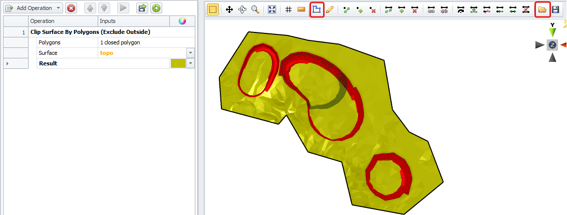 Intersect a surface with a polygon(s). This can be digitised or imported. Exclude the outside. |