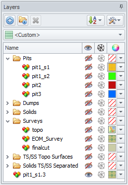 In the Layers panel you may import surfaces and solids triangulations, display and organise them, as well as assign colors, visibility etc. For a detailed description of Layers panel options, see: Layers/Overlays Panel