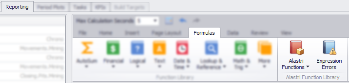 There are a number of Functions that can be used to pull in data from the schedule. These functions are found under the Formulas Ribbon Tab in the Alastri Functions Ribbon Control.