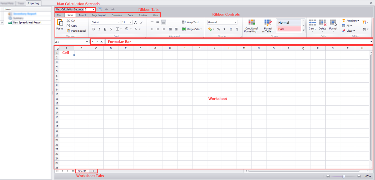 Inside RR it is possible to create Spreadsheet reports similar to what you would find in Microsoft Excel. Navigating and generating reports should be relatively straightforward if you are familiar with Excel. A high-level overview of the report and the key functionality is provided below.