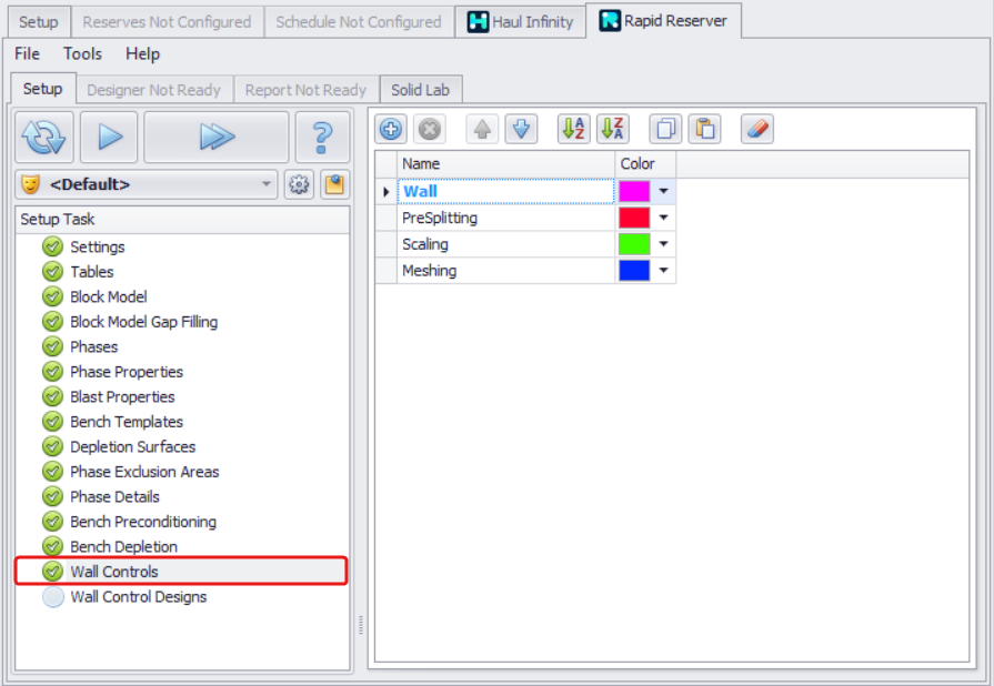 The Wall Controls step allows users to specify properties based on the outer edges of pit and dump solids. These could include wall edges and presplit edges which could be used to calculate drill and blast values in scheduling software downstream.