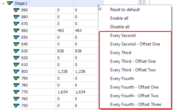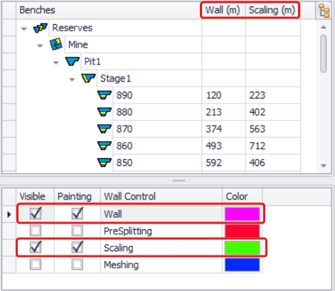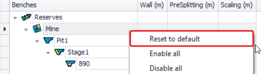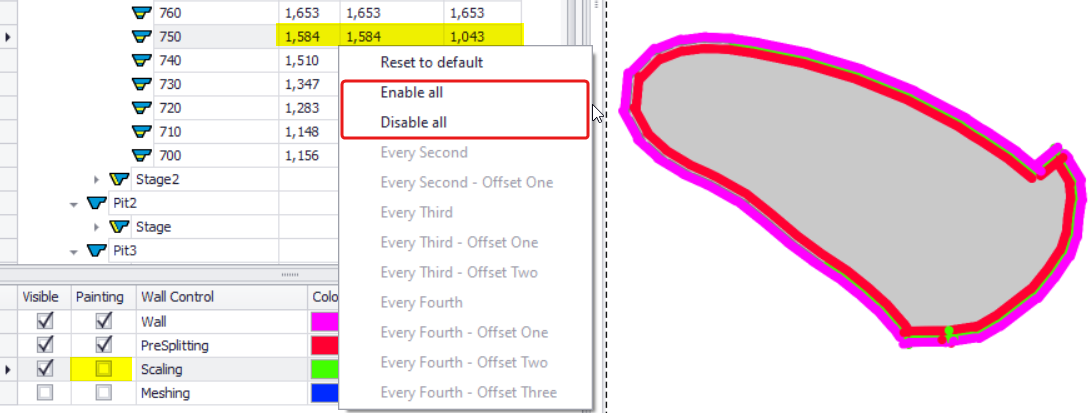 Right-click on the level required and select Enable All or Disable All to add/remove wall control(s) around the whole bench(es) extend. It applies only to the visible Wall Control(s) flagged for painting. In the example on the right, “Enable All” is not being applied for the Scaling, since it is not flagged for painting. You can Enable All / Disable All wall controls for the whole mine/pit/stage, if you right-click on the parent level and run this function. |