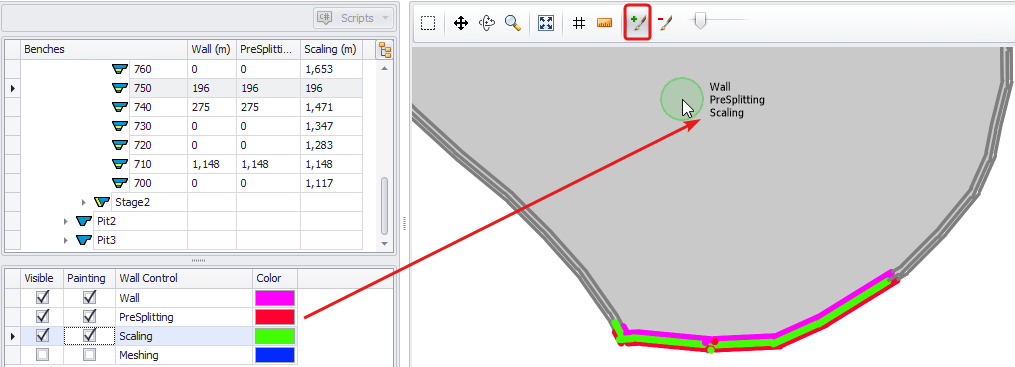 From the toolbar above the viewport, select a drawing tool (Add Wall) to mark areas where wall control(s) should apply. Note that you’ll be drawing simultaneously as many wall controls as flagged for Painting in the panel below the list of benches. Set flags for those wall controls you want to specify. |