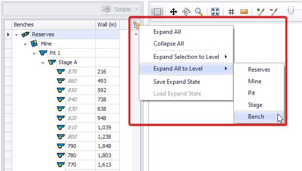 Select the bench required from the Benches tree. It will be displayed in the main viewport. Use the Expand/Collapse button to Expand All or Expand All to a Selected Level. Italicised bench names indicate that the bench has been mined out or excluded through previous steps. |