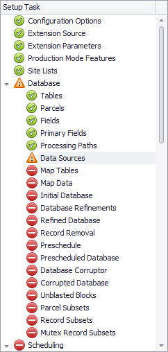 When setting up a project for the first time, all setup tasks need to be performed in the specified sequence. You cannot proceed to the red marked step without confirming the previous one. During the subsequent work with the configured project, you can return to any of the steps, but after making changes you will need to rerun all the tasks below in the list. This is because changes you make in a single step can affect settings in related tasks and need to be reviewed or adjusted.
