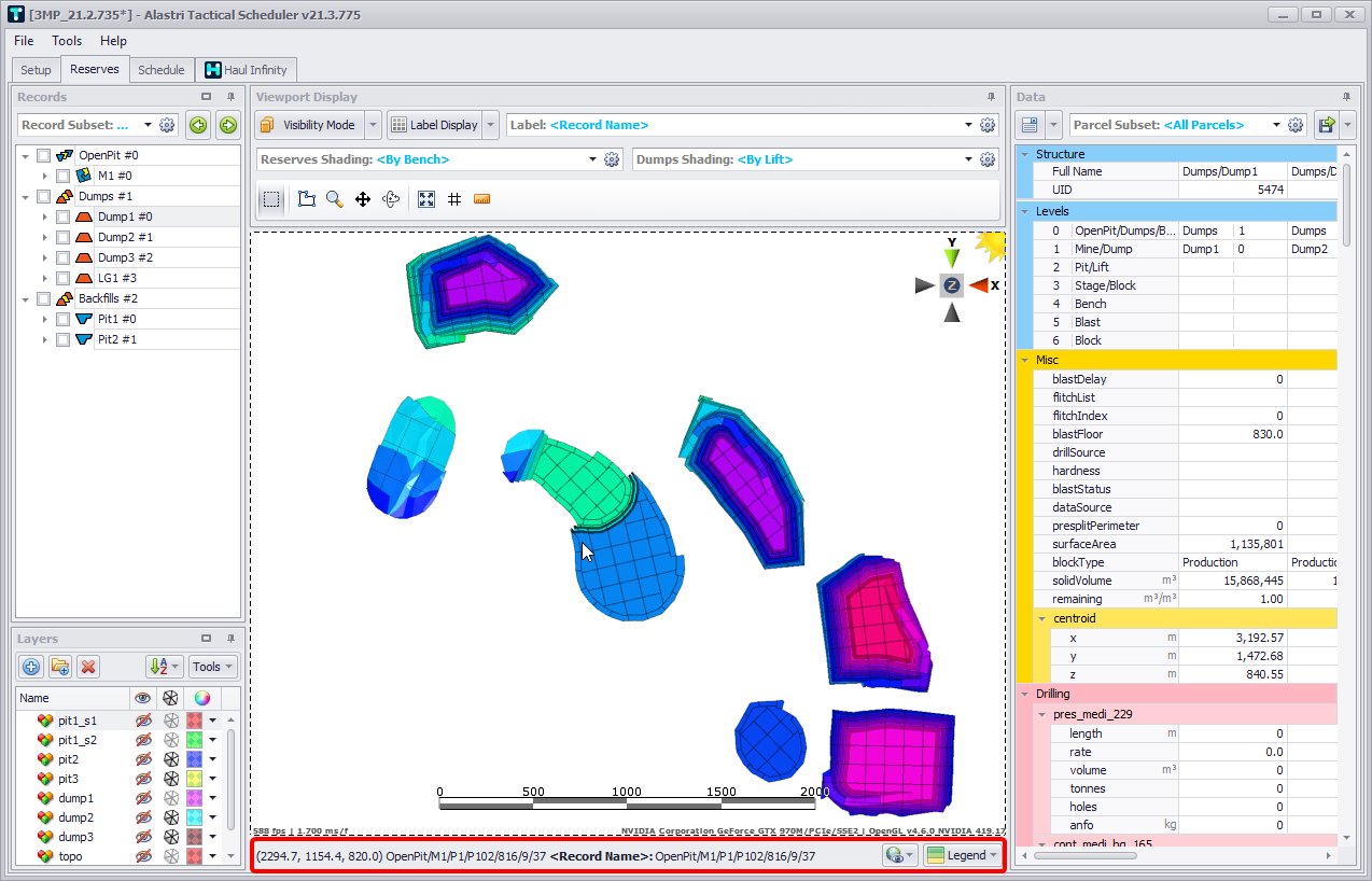 The status bar display information for the current mouse location. It includes coordinates and the full name of the level record. The information displayed changes as you move the mouse cursor.