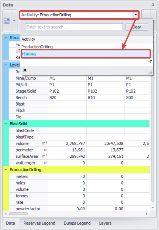 Switch between activities to see the quantities of work in each parcel. The database layout changes to show fields that relate to the selected activity.