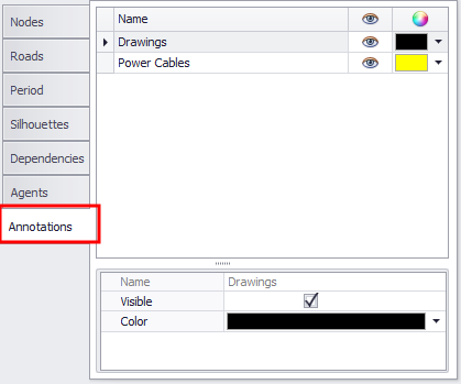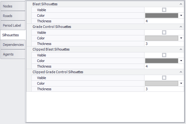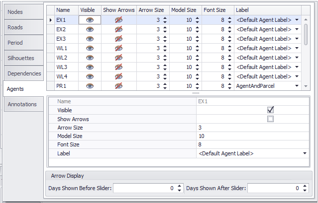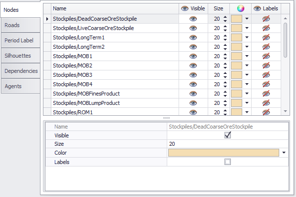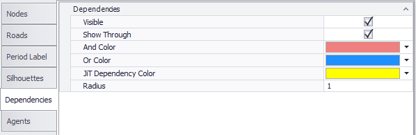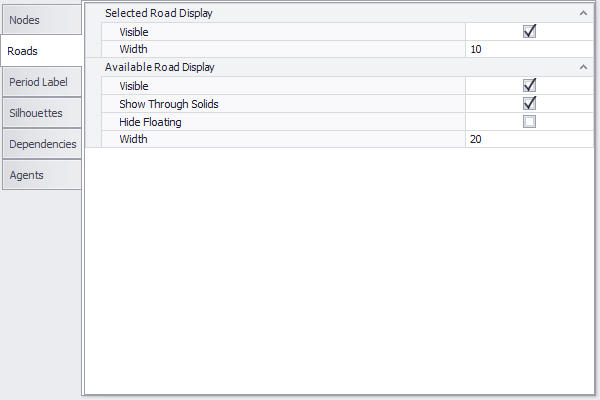 In this window, you can set various display settings for individual components, such as Nodes, Roads, Period Label, Silhouettes, Dependencies and Agents.