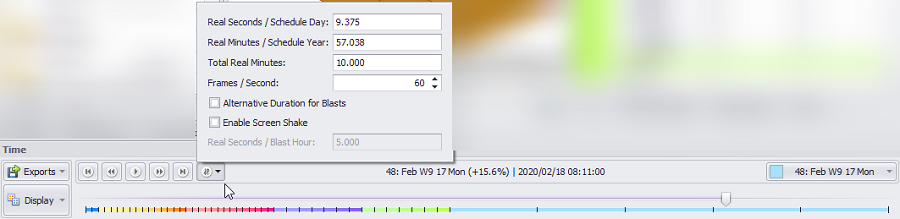 Click the settings button to expand the time settings dialog, where you can set the ratio of real seconds/minutes to days/years as per schedule.
