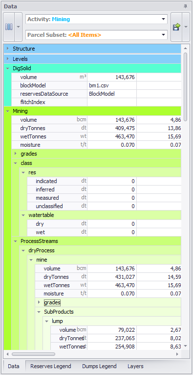 The Data panel allows the user to organize the data being processed. The main panel area lists all related fields, displayed according to the selected blocks in the Viewport or in the Records panel. To the left of the name of each field there is a small triangle icon, clicking on which will reveal or hide the hierarchy of this level. Use this feature to simplify and filter the data you need to work with.