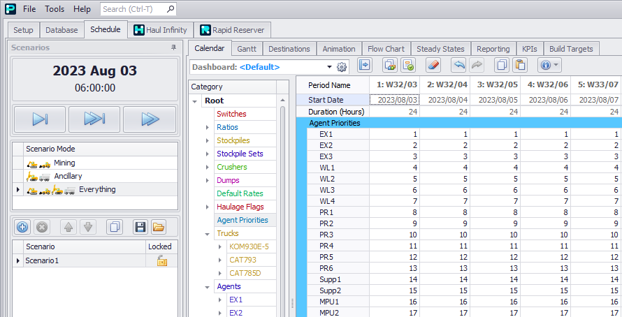 The Calendar tab consists of two main parts: The Dashboard and the Calendar itself. Dashboards allow a user to create custom Calendar layouts. This can be used to organise rows into a concise summary of equipment used, tonnes moved, and grades achieved. For more details, see: Calendar Dashboards