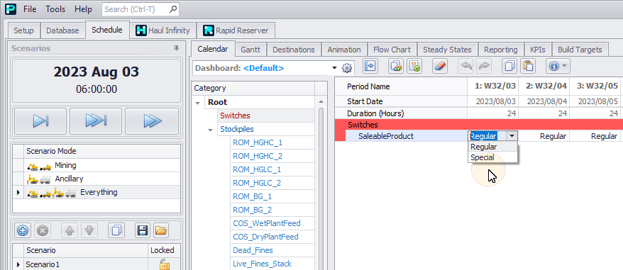 Switches may be used to change destinations and material flow over time. For more information, see: Calendar Switches, Destination Rules, Flow Chart