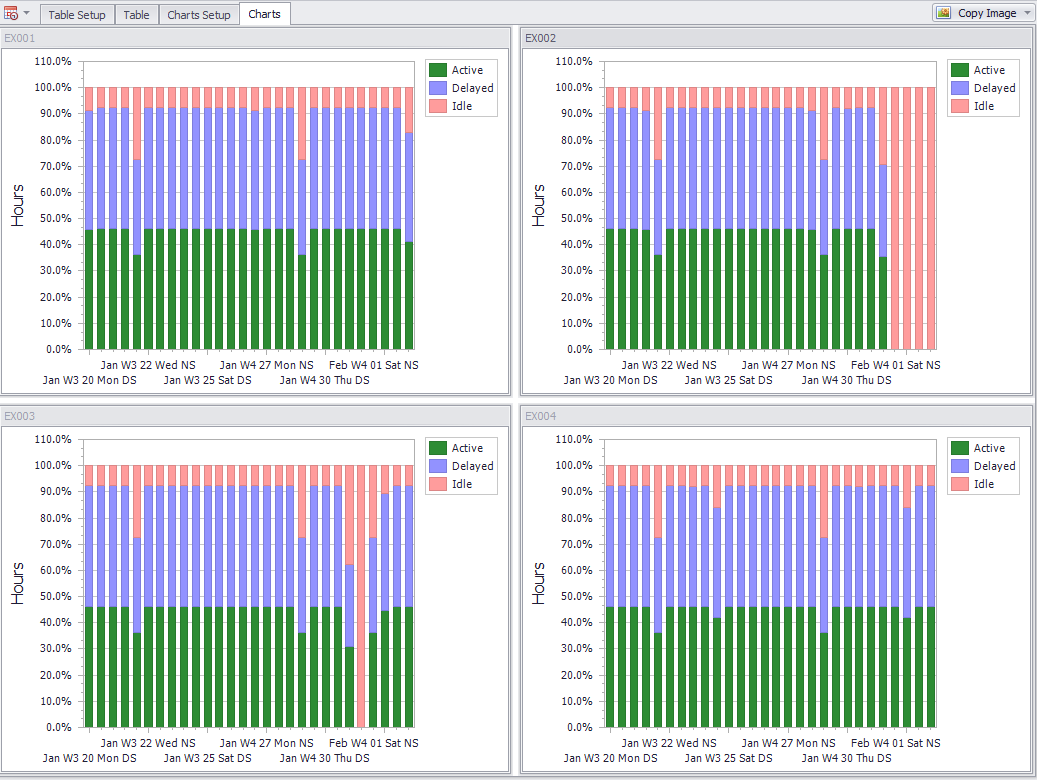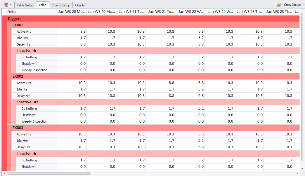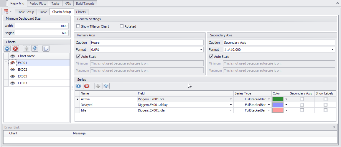 Set the fields to “Diggers.EX001.ProdHrs”, “Diggers.EX001.Delay” and “Diggers.EX001.Idle”.