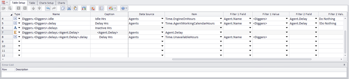 | 4 | Row | Diggers.<Diggers>.idle | Idle Hrs | 2 | Agents | Time.EngineOnHours |