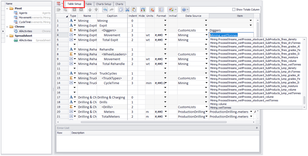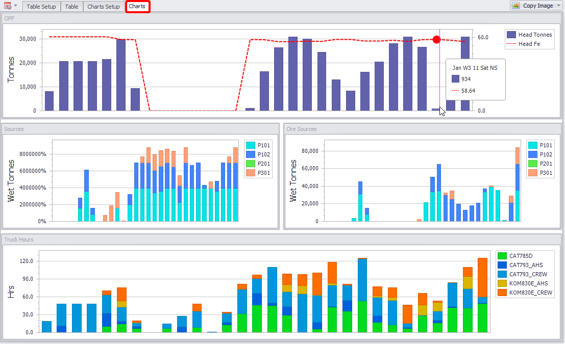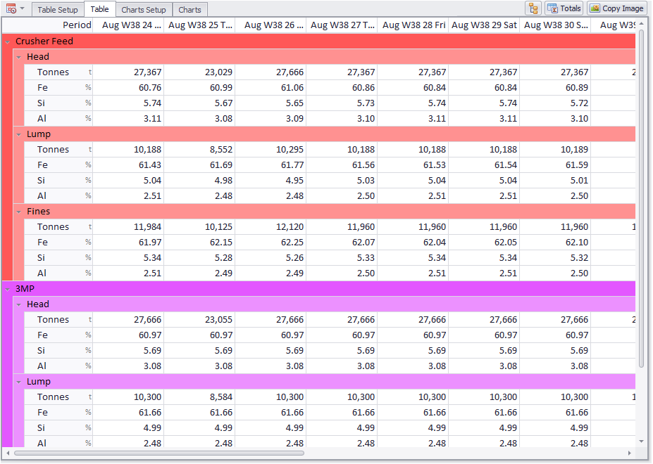 Chrono reports are the static reports with the data, organized in columns and in rows. These reports are used to create static report tables to match business standard templates. Chrono reports allow the user to create tables with a mix of data (digger tonnes, crusher grades, truck hours, drill meters), and to visualize the data in charts.