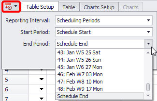 Use Change Time Settings button to set reporting intervals and start/end periods. You may choose to report by "Scheduling Periods", "Number and Name", "Calendar Years", "Financial Years", "Calendar Quarters" etc. For the Start and End periods you may select certain periods dates or schedule start/end to display in your report.
