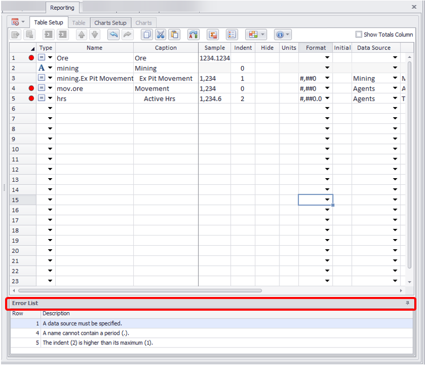 A red circle on the left of the Type column indicates that you have made some mistakes filling up a table or there are some unresolved issues. Check the Error List below to get a description and fix all the errors listed.