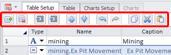 Report rows can be added, removed, indented, moved up/down, copied, cut, pasted using the top toolbar.