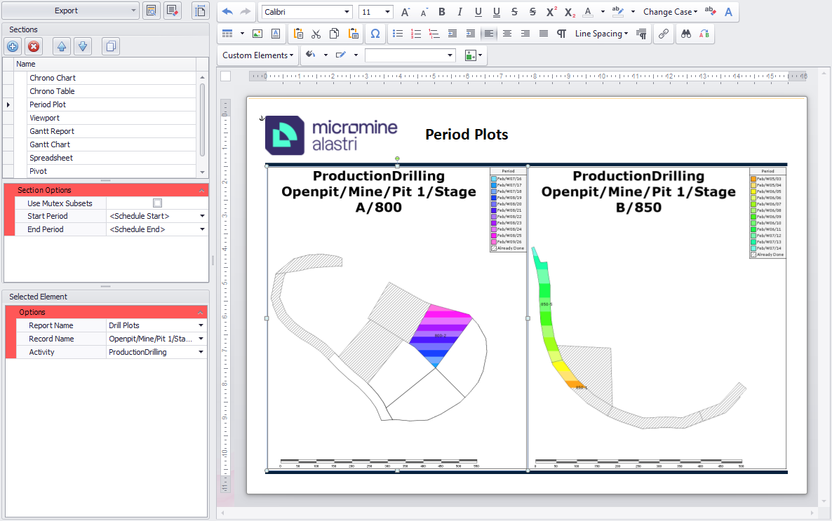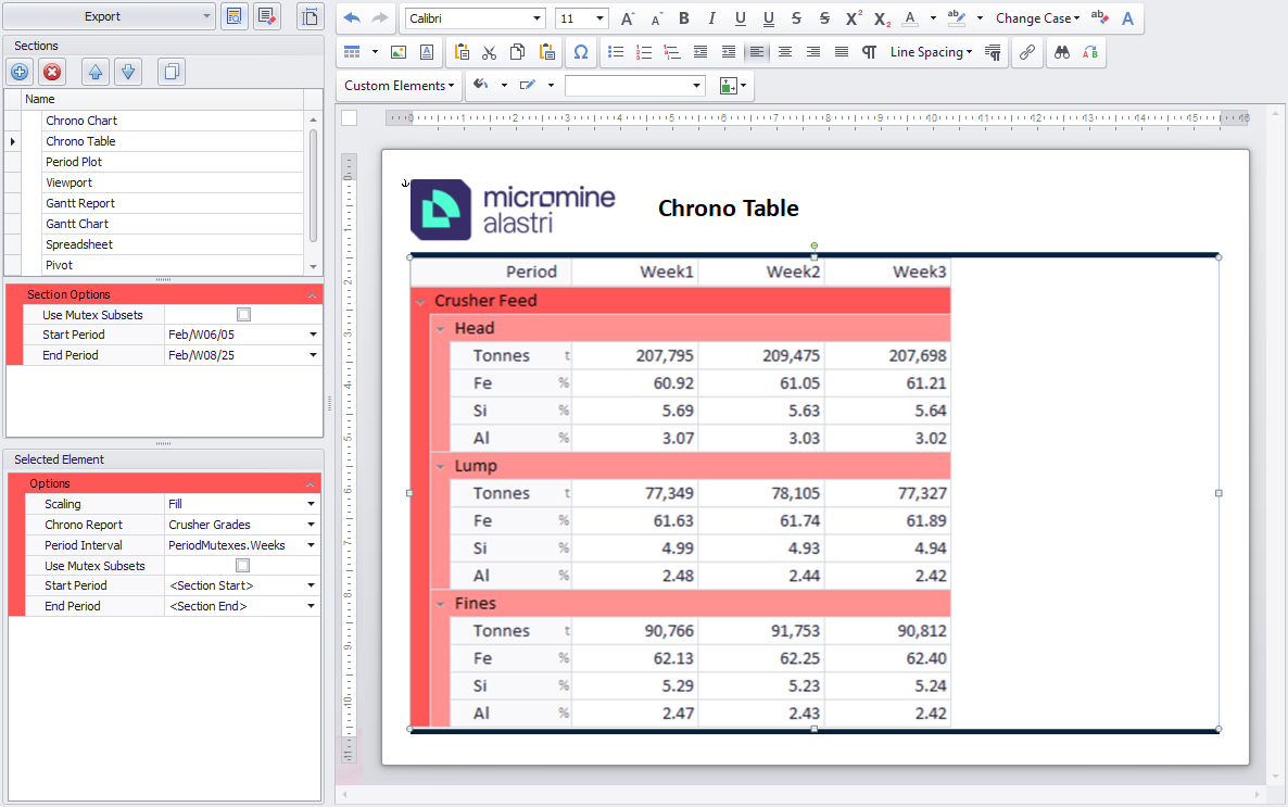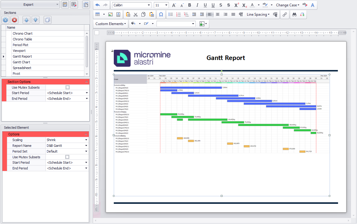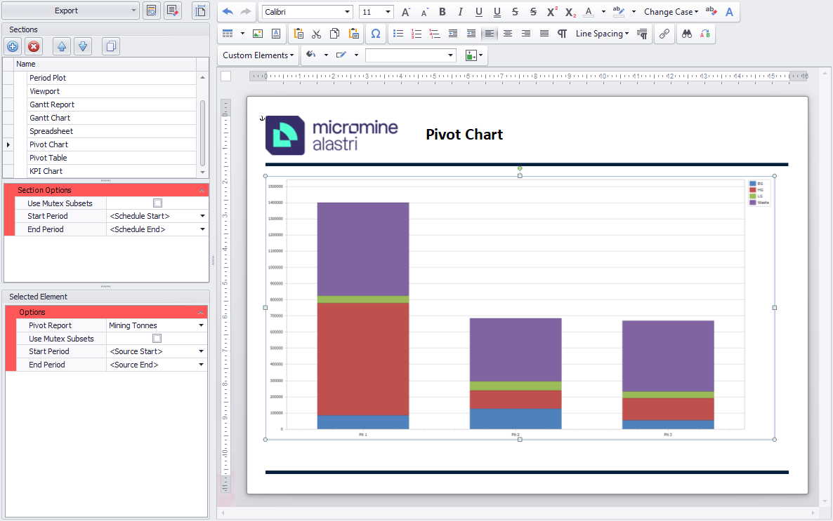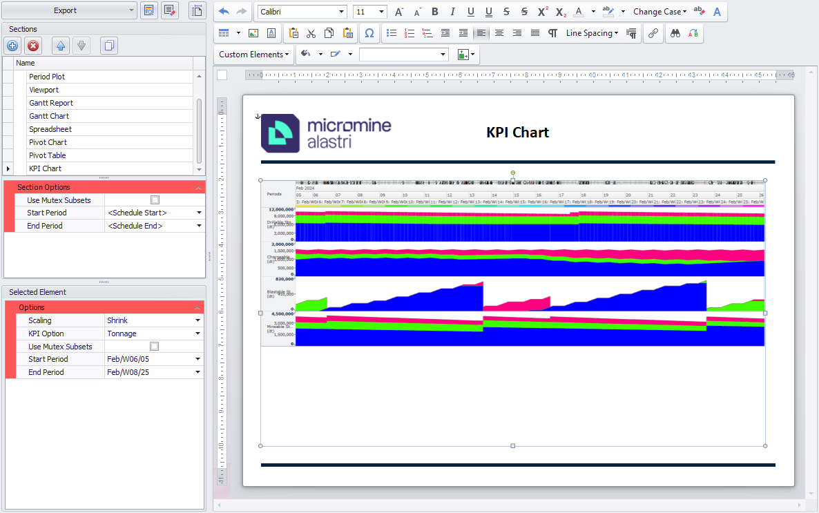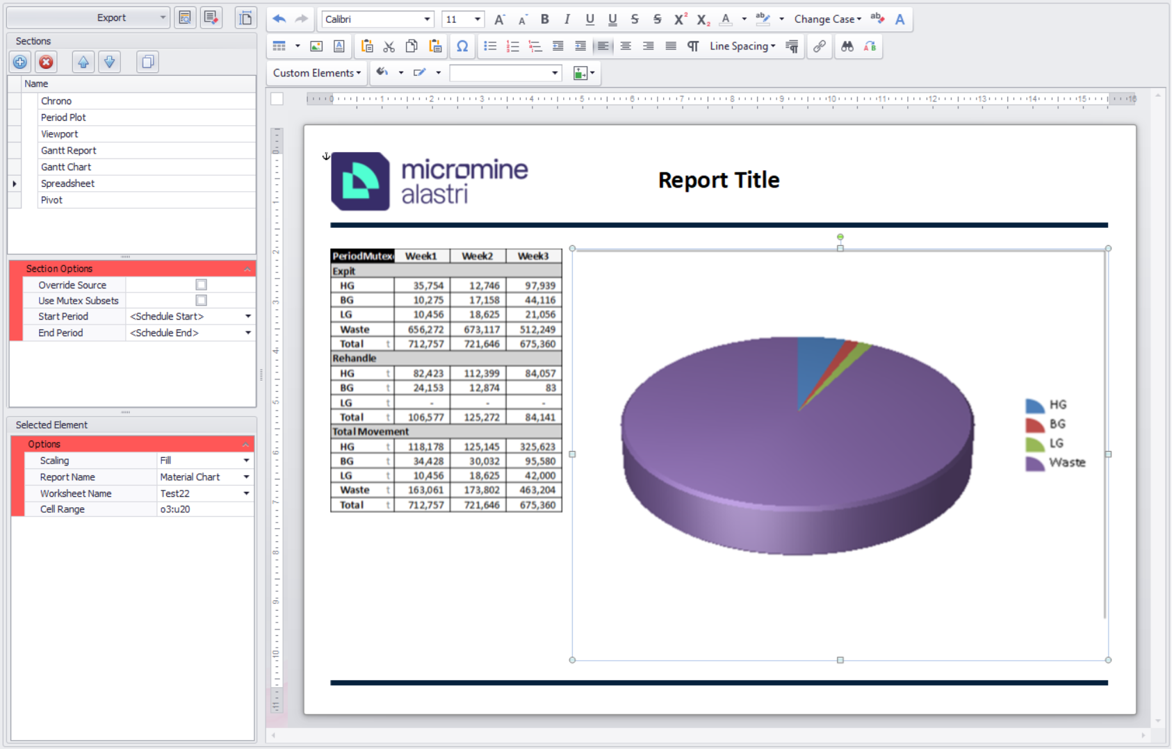 The layout of the custom report is built here by adding elements, images, text boxes etc. Multiple pages can be added, if desired. It is important to note that the report behaves more like a Word document than a PowerPoint.