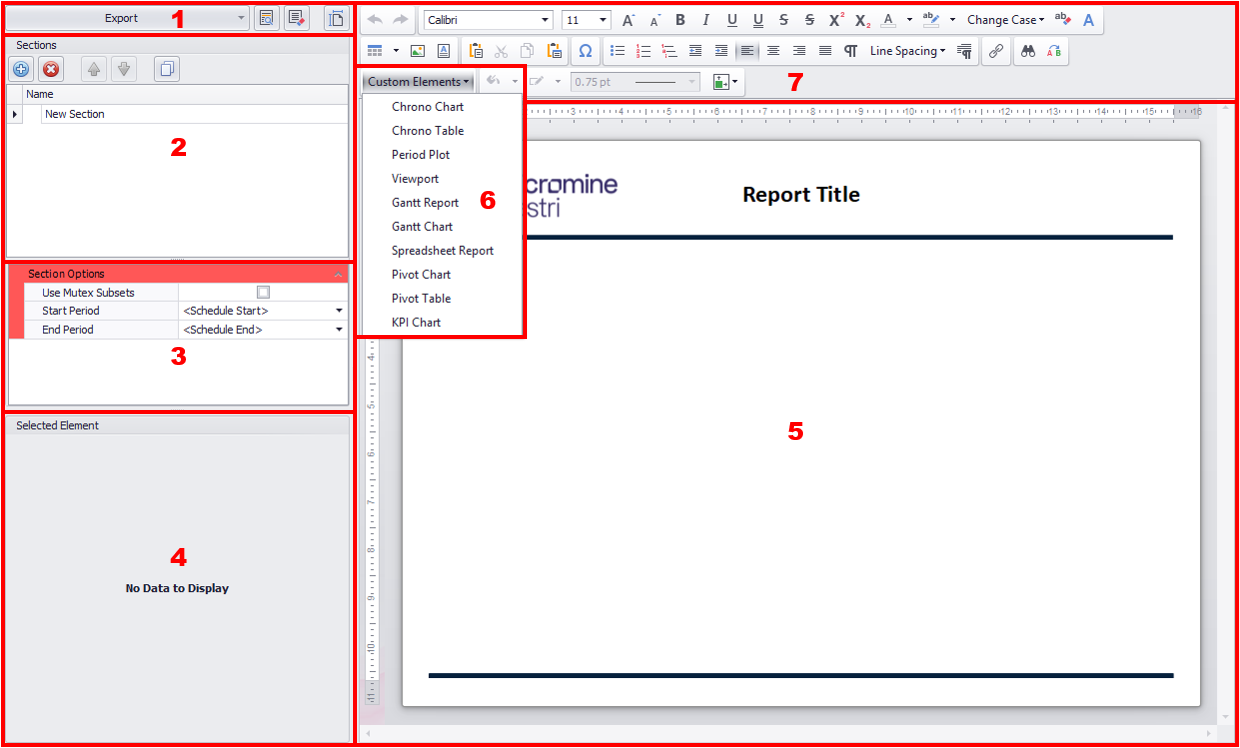 The Custom Elements drop-down contains nine different elements that can be added to the report. See: Custom Elements (below)