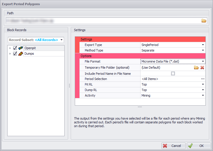 Each file will automatically be given a name that includes the period number it represents. Files beginning with "EndP" include polygons mined or dumped in that period. Files beginning with "CumEndP" include the cumulative changes from previous periods. If "Include Period Name" is checked, the period name will also be included in the file name.