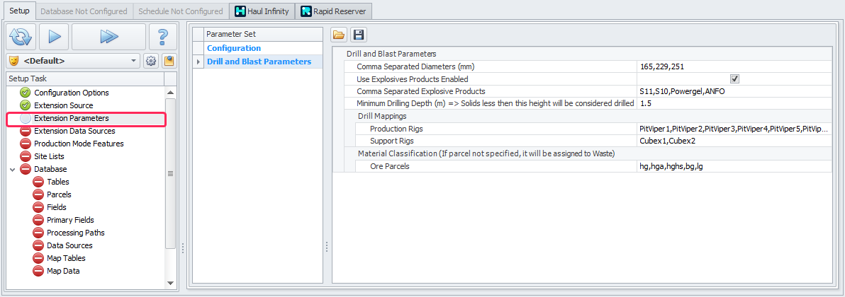 The Extension Parameters step contains custom global variables such as the site name, drill and blast properties, and so on. These inputs vary from site to site depending on the requirements of the Extension scripts.
