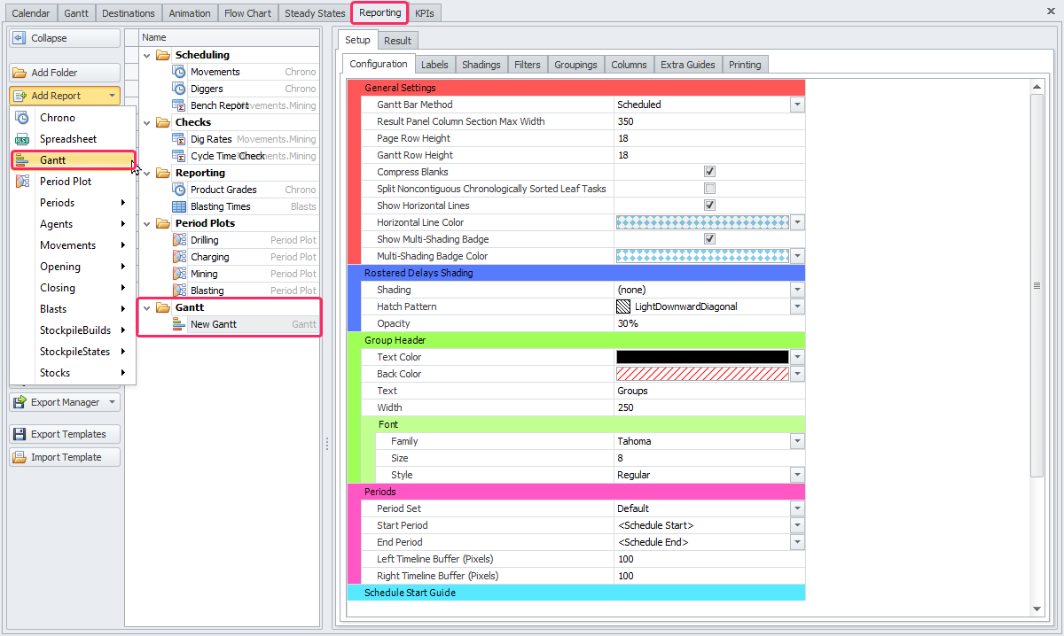 To add a new Gantt report, in the Reporting tab press Add Report button and select Gantt option.