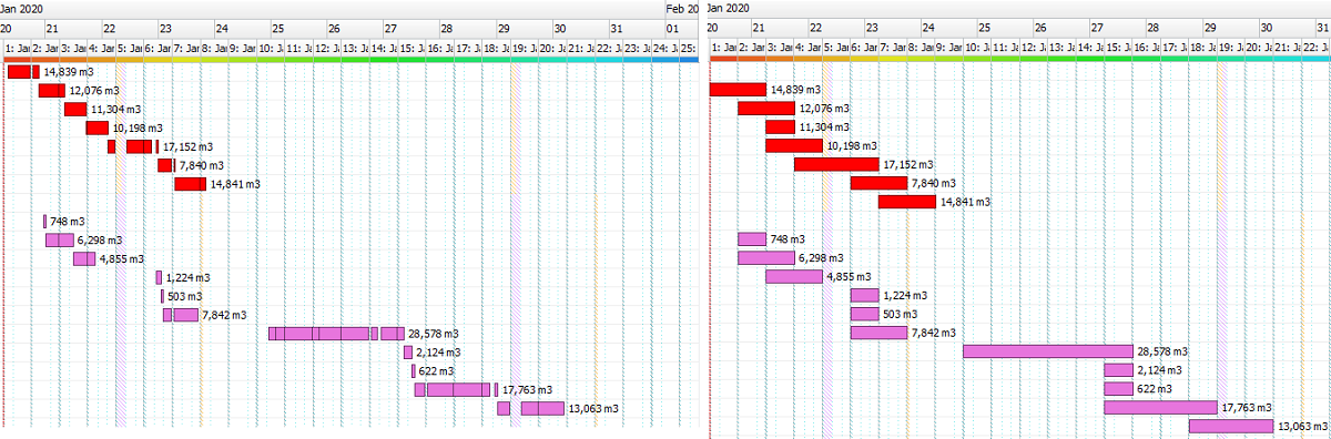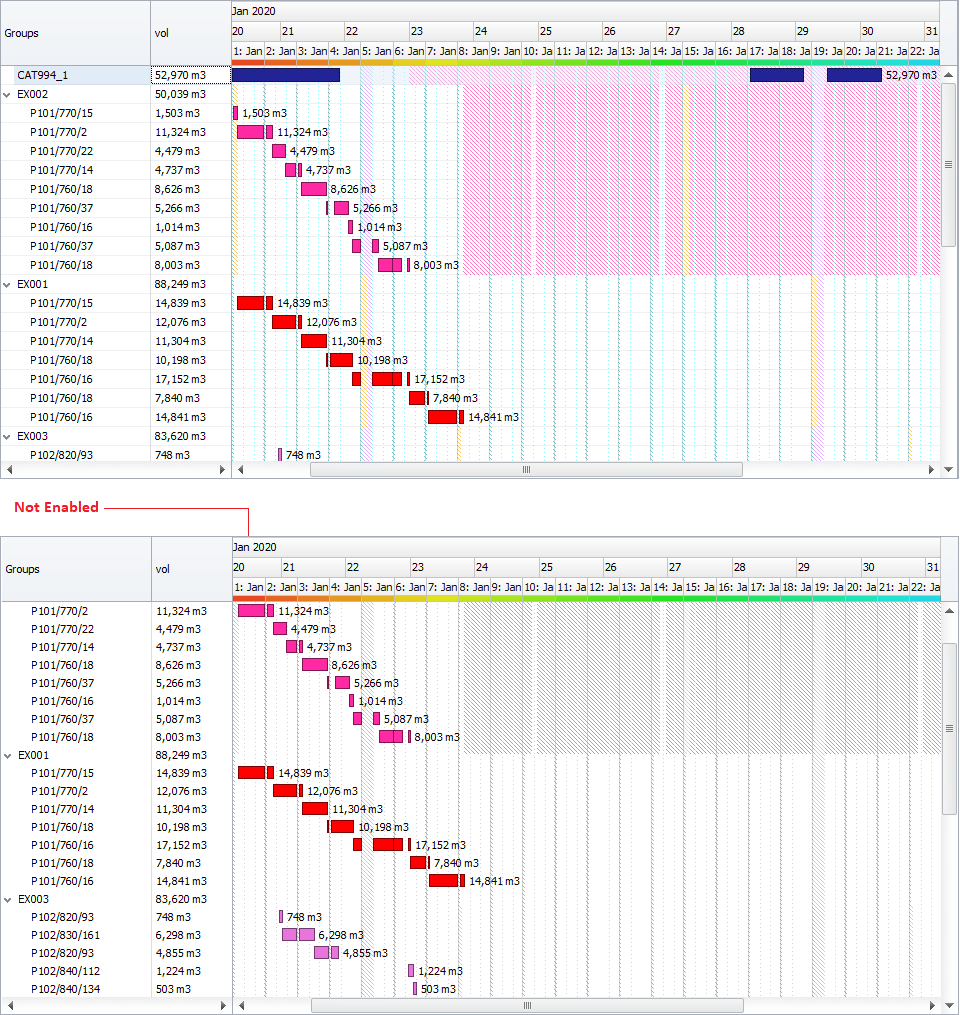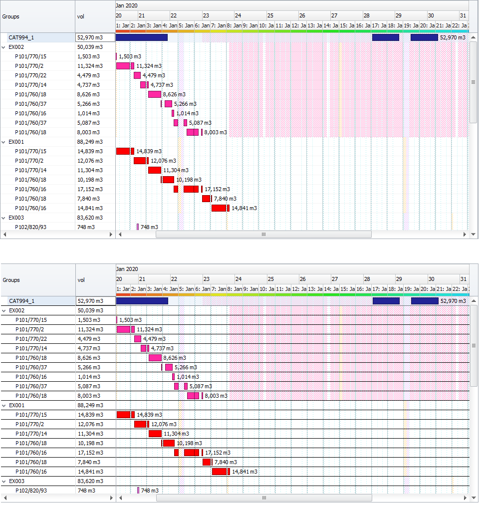 Note that in order to see Rostered delays in the Gantt report, the Agent must be added as Group Option in the Grouping tab, otherwise no delays will be displayed for Activity/Source/Destination group options. |