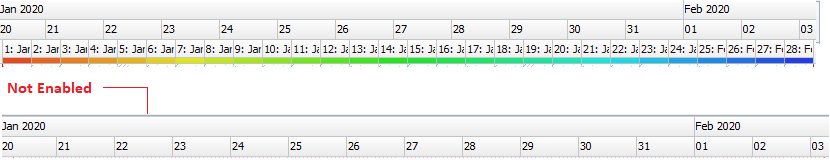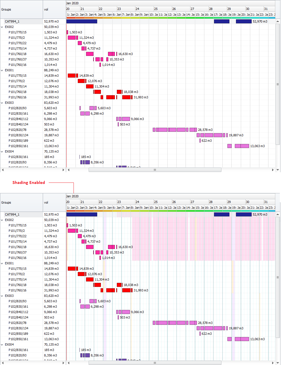 You can choose from one of the Shadings options (created in the Shadings tab). Alternatively you can choose <Continuous/Discrete Solid> and then choose a color for the bar. You can also choose “(none)”, in which case no bar will appear on the row. There are certain types of shadings that can only be shown if at the level the shading is applied has been filtered down to a single activity either through the selections at a level above or through the Filters tab.