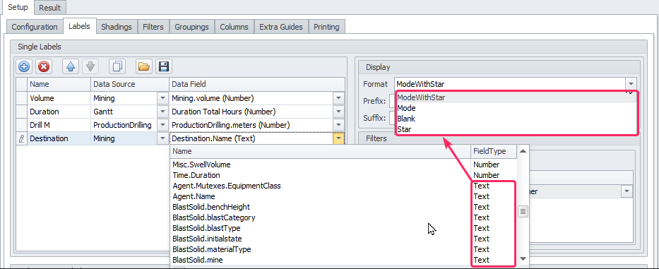 Select labels for each column. Labels are added and configured in the Labels tab.