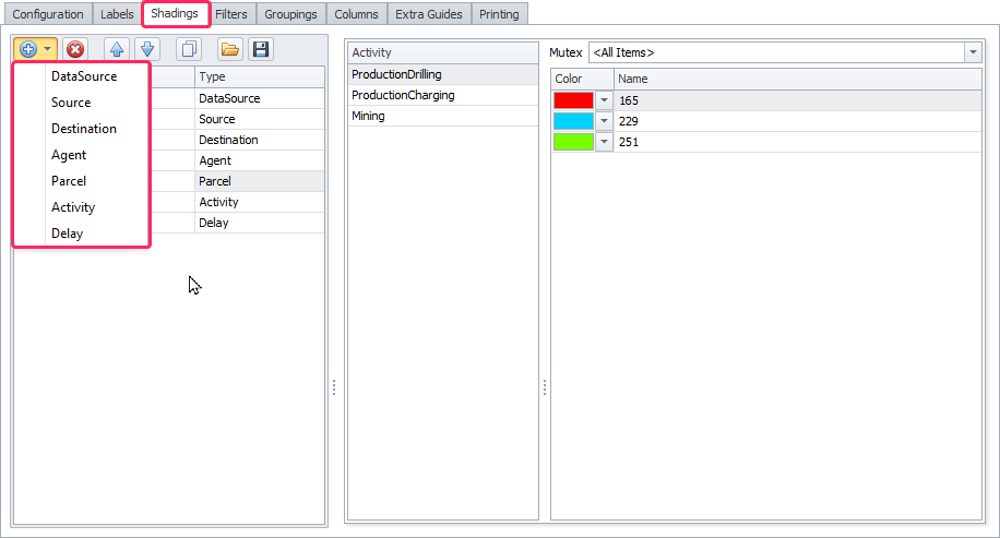 You can then choose colors based on the mutex selected, rather than for each item. There’s always an <All Items> option which will just show you every unique value. If a mutex is available (which are not available for all types, and are configured in the Setup tab), it will only show the options of the mutex. For example: