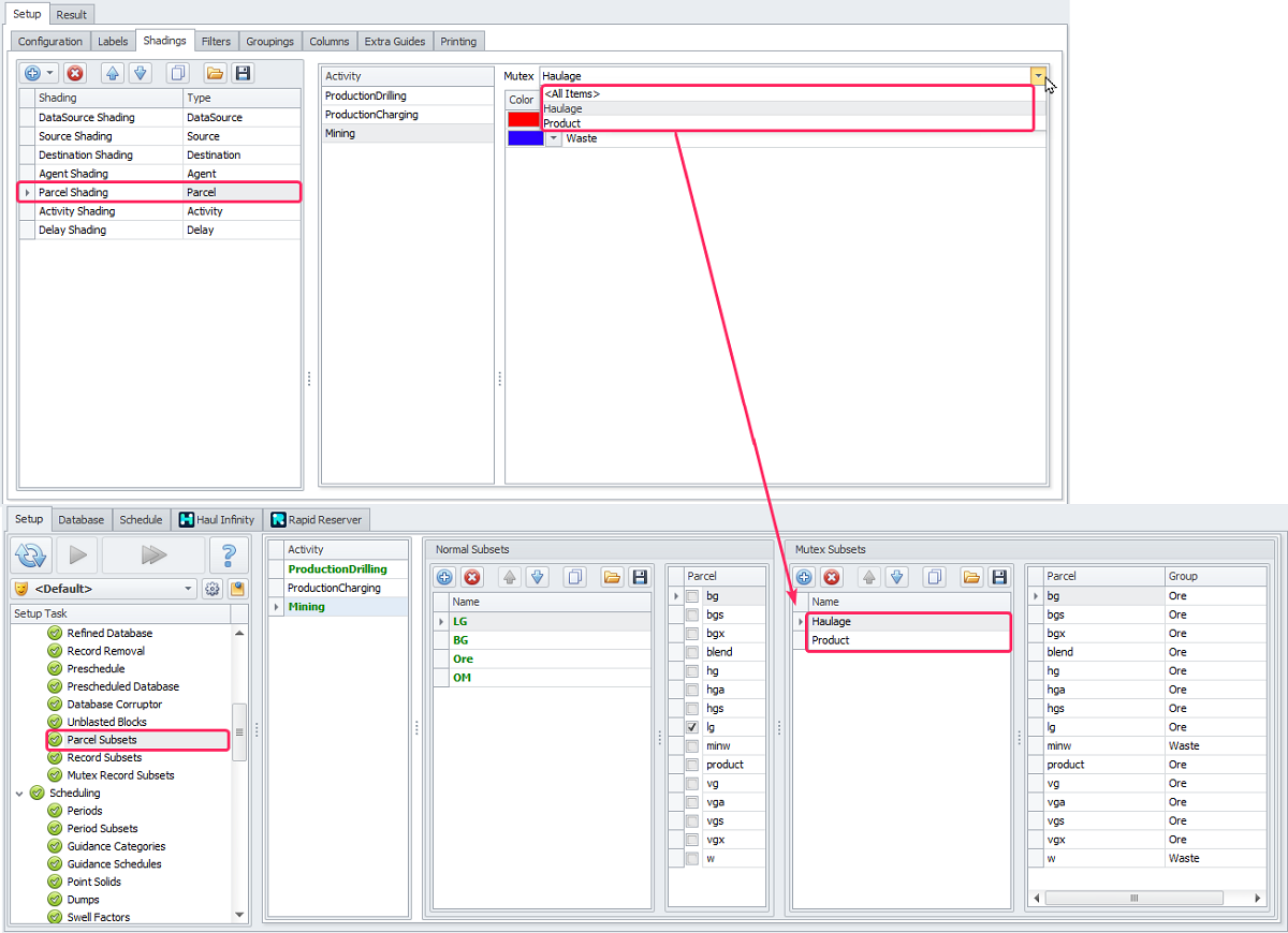 Mutex for Mining/Drilling/Charging Parcels is configured in Setup > Parcel Subsets > Mutex Subsets.